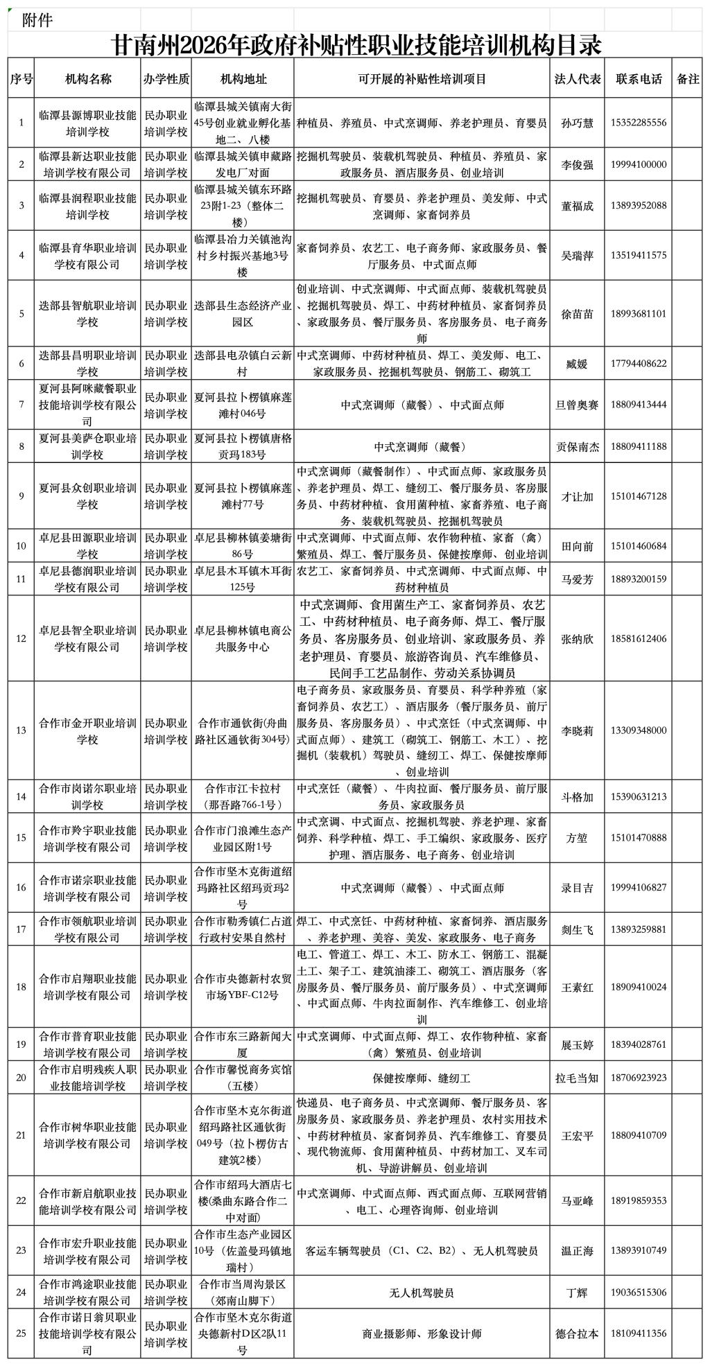 为进一步规范补贴性职业技能培训机构管理,提高我州政府补贴资金使用效益,根据省政府办公厅《关于印发开展大规模职业技能提升培训实施方案(2025-2027年)的通知》(甘政办发〔2025〕66号)和省人社厅、省教育厅、省财政厅等9部门《关于分解下达甘肃省2026年职业技能培训计划的通知》(甘人社通〔2026〕92号)要求,州人社局制定了《甘南州2026年政府补贴性职业技能培训机构目录》,现予公布。请各县市人社局结合工作实际,通过公开招标等政府采购模式择优遴选开展补贴性培训项目的培训机构,其它市州列入补贴性培训机构目录的,也可参与我州政府补贴性职业技能培训工作。