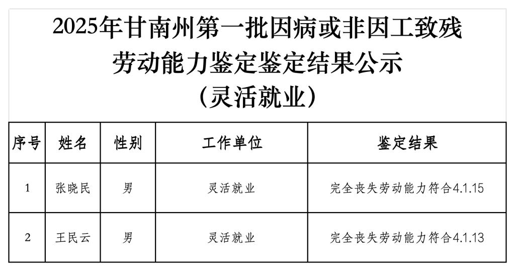 2025年12月9日,州劳动能力鉴定委员会召开专家组会议,对10名申请因病或非因工致残劳动能力鉴定的职工(灵活就业人员)和123名申请工伤职工劳动能力鉴定的工伤职工进行了现场鉴定。现将鉴定结果予以公示,接受社会各界监督。