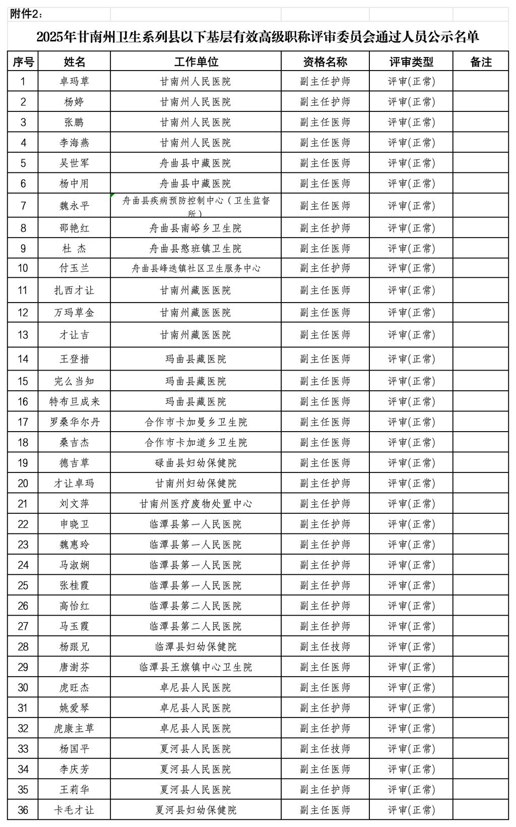2.甘南州卫生系列县以下基层高级职称评审委员会通过人员公示名单