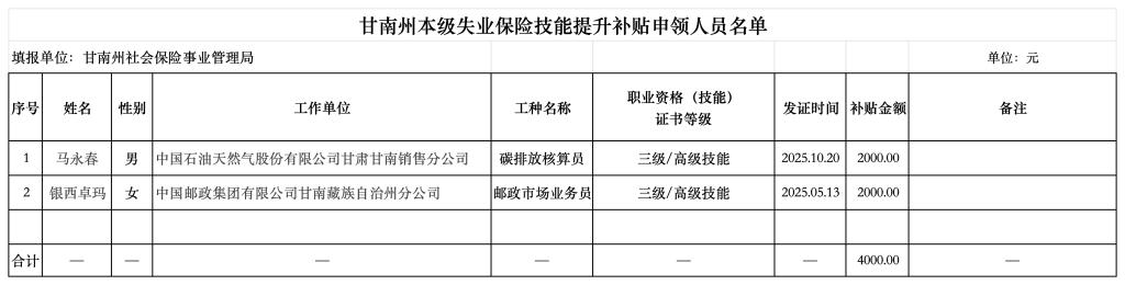 根据《关于转发〈甘肃省人社厅 省财政厅关于失业保险支持参保职工提升职业技能有关问题的通知〉的通知》(州人社字〔2017〕308号)精神,我局对马永春等人员的申请材料进行审核,符合申领条件,拟同意其申领,现将申领人员信息予以公示。公示时间:2026年1月8日—2026年1月14日,共5个工作日。如有异议,请向甘南州社会保险事业管理局待遇审核科反映。